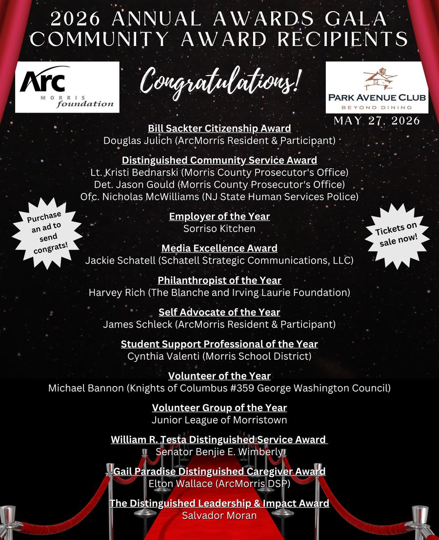 The ArcMorris Annual Awards Gala celebrates extraordinary impact while raising critical funds to support the life-enriching programs of ArcMorris. Join us for an inspiring evening as we honor individuals, organizations, and community partners who are making a meaningful difference in the lives of people with intellectual and developmental disabilities.